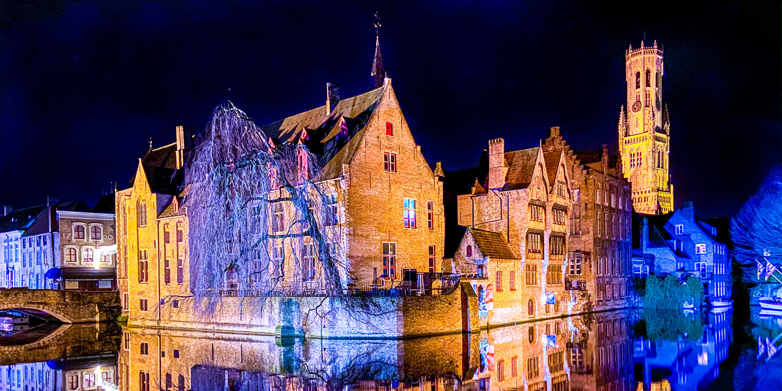 Drie bomen zitten deels in de zon en werpen zo een gouden reflectie in het water.