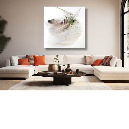 Een lichte, elegante compositie van delicate veren, met centraal een opvallende pauwveer waarvan het iriserende oog in groen-blauw subtiel schitter...