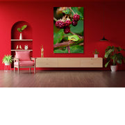 Boomkikker op bramentak met rode braambessen op de achergrond