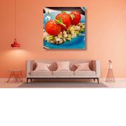 Fraai gestileerd culinair gerecht bestaande uit drie perfect gepelde, helderrode tomaatjes die elegant op een basis van fijngesneden groenten en kappertjes zijn geplaatst. De frisse kleuren van bleekselderij, ui en augurk vormen een smaakvolle en visueel aantrekkelijke tegenhanger voor het warme rood van de tomaten. Een subtiel takje microgroen bovenop het gerecht zorgt voor een verfijnde afwerking en geeft het geheel een moderne, gastronomische uitstraling. De helderblauwe bordkleur versterkt het contrast en laat de ingrediënten nog meer naar voren komen. Het resultaat is een levendig, fris en professioneel gepresenteerd gerecht dat uitnodigt tot proeven.