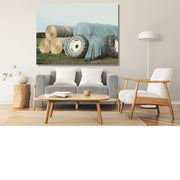 De ingehaalde hooibalen worden afgedekt met een zeil en vastgezet met oude tractorbanden.