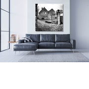 Zwart-wit foto van een historisch huis met grote inrijpoort en smeedijzeren poort. Erfgoed