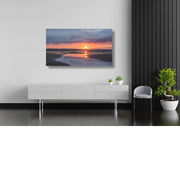 Deze zonsondergang is fantastisch. Een warme gloed met daarboven intense wolken en onderaan reflecties op het strand.