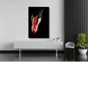 Close-up van een rode paprika die in water valt, met dynamische spetters tegen zwarte achtergrond.