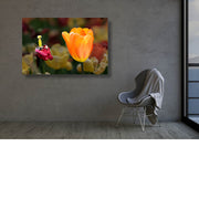 Twee tulpen, een oranje en een rode die aan het verwelken is, waarschijnlijk een parkiettulp (Tulipa gesneriana var. dracontia), een tulpensoort die bekend staat om zijn grote, gekartelde en gevederde bloemblaadjes.