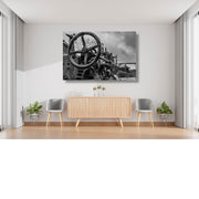 Zwart-witfoto van een oude industriële machine met tandwielen en een groot stuurwiel, buitenomgeving.