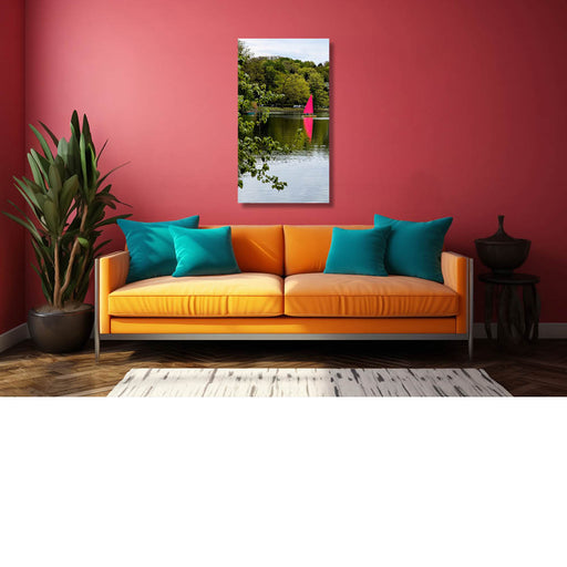 Kristof De RoyHet felroze zeil van de zeilboot maakt een mooie reflectie op het meer van Genval.