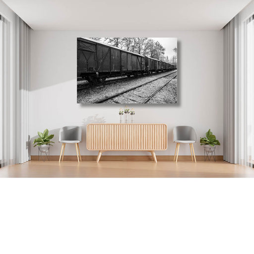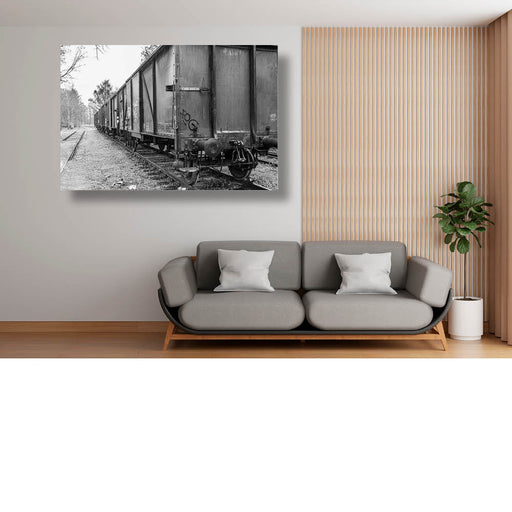 Steven VaesZwart-witfoto van een rij oude goederenwagons op een verlaten spoorlijn