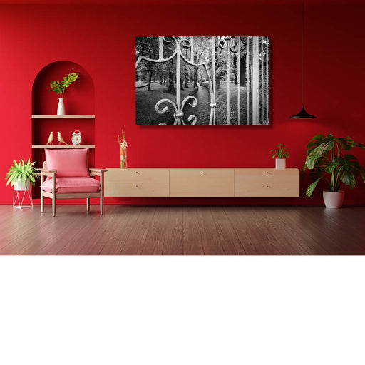 Steven VaesZwart-witfoto van een sierlijk ijzeren hek met zicht op een park en kronkelende beek.