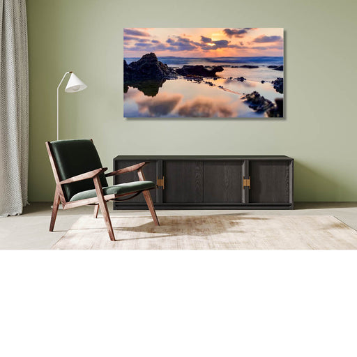 Ophira EschinasiGestileerd beeld van een zonsondergang aan de kust, met de zon die ondergaat aan de horizon. De lucht is gevuld met oranje, roze en paarse tinten, ...