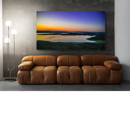 Ophira EschinasiEen zonsondergang aan de kust, met de zon die ondergaat aan de horizon. De lucht is gevuld met oranje, roze en paarse tinten, die worden weerspiege...