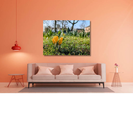 Kristof De RoyOp de voorgrond staan mooie oranje krokussen, terwijl anderen nog zullen volgen op de achtergrond.