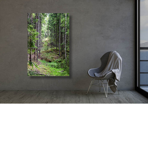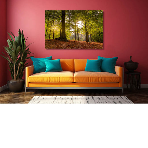 Ophira EschinasiEen rustig beeld van groene bomen, de bosvloer en een straaltje zon.
