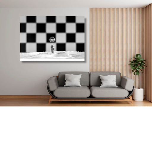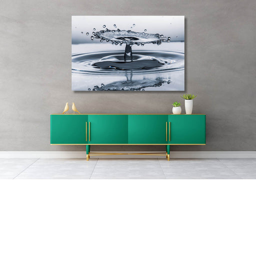 Jessie Van Dyckmacro-opname van een waterdruppel op het moment van impact met reflectie in druppel van zwart met wit geblokte achtergrond