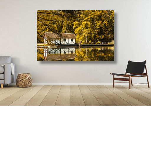 Jessie Van Dyckherfstfoto van het boothuisje in het Park van Brasschaat met reflectie in het water