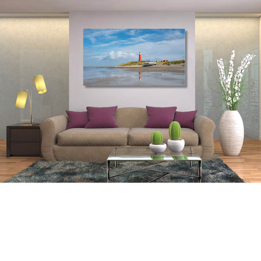 Texel, vuurtoren vanop het strand, reflectie vuurtoren in strandplas