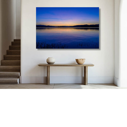 Zonsondergang meer en heuvels
