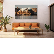 Foto van witte gebouwen op een rotsachtige kustlijn, met kalm water op de voorgrond.