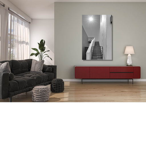 Steven VaesZwart-witfoto van een trap en witte muren met een zon die straalt in de lucht, modern en minimalistisch.