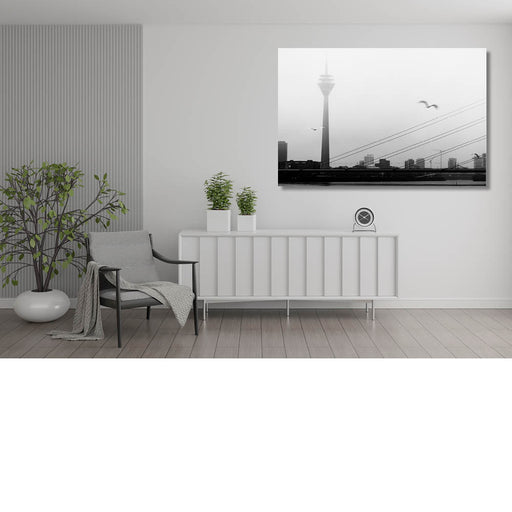 Steven VaesZwart-witfoto van een stad in mist met zendmast, brugkabels en vliegende vogels boven de rivier.