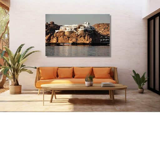 Steven VaesFoto van witte gebouwen op een rotsachtige kustlijn, met kalm water op de voorgrond.