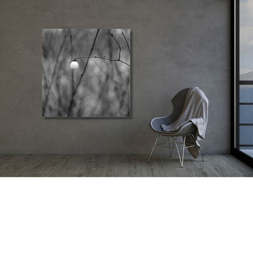 Steven VaesZwart-witfoto van een enkele witte bes aan een dunne tak tegen een onscherpe achtergrond.