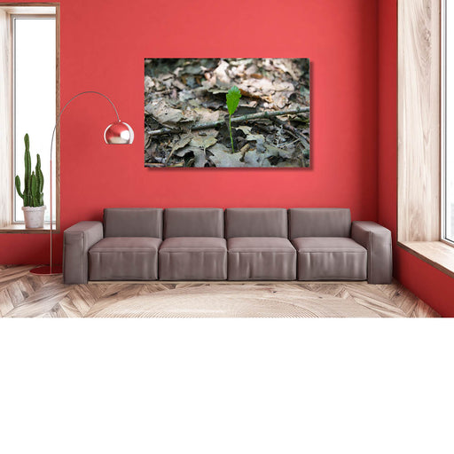 Kristof De RoyEen jonge scheut van een eikenboom baant zich een weg door de dode bladeren.