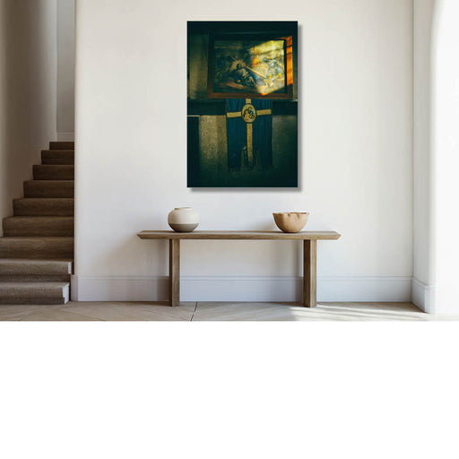 Bettina HelewautVerlaten huis met achtergebleven religieuze voorwerpen. Het zonlicht speelt op het geweldadige tafereel terwijl Jezus zijn kruis draagt. Het vredi...