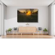 Intense zonnestralen breken door de bomen in een mistige ochtendweide. Het landschap baadt in warme tinten en zachte nevel, wat een krachtige en sfeervolle compositie oplevert.