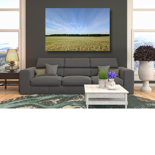 Kristof De RoyAchter dit tarweveld ligt een bosje, omhuld in een uitwaaierende lucht.