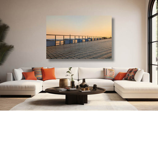 Kristof De RoyDe ondergaande zon werpt schaduwlijnen op de dijk, het casino van Middelkerke op de achtergrond.