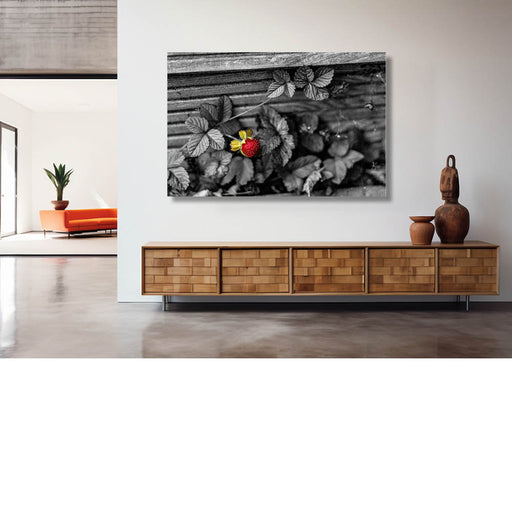 Steven VaesArtistieke foto van een rode aardbei tussen bladeren en houten planken, met selective color techniek.