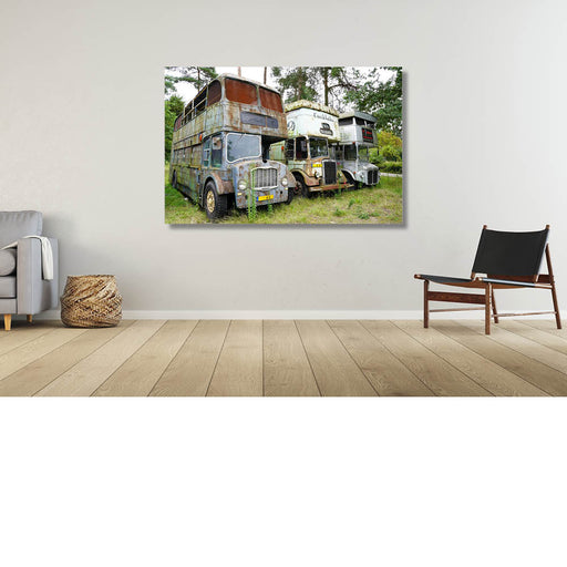 Bettina HelewautDrie oude Engelse bussen staan ergens in open lucht te roesten. Ze hebben hun diensten bewezen en genieten nu van hun pensioen.