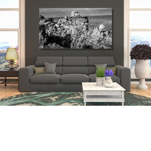 Steven VaesZwart-witfoto van een rij houten palen die een golfbreker vormen, lopend richting de zee.