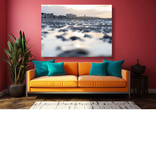 Steven VaesFoto van een strand met nat zand en reflecties van zonlicht, gebouwen op de achtergrond en zachte wolkenlucht.