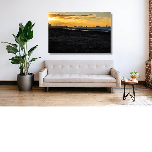 Steven VaesFoto van een strand met dramatische wolkenlucht en havenkranen op de achtergrond bij zonsondergang